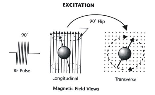 nucleus spins around the axis of the magnetic field and generates an RF signal.