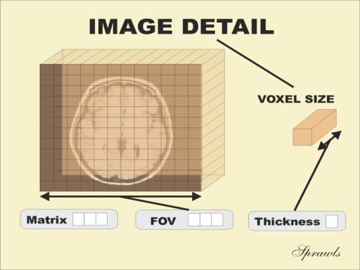 | Figure 10-2. Voxel size and detail in MR images is determined by the values selected for the three protocol factors: FOV, matrix size, and slice thickness. |
